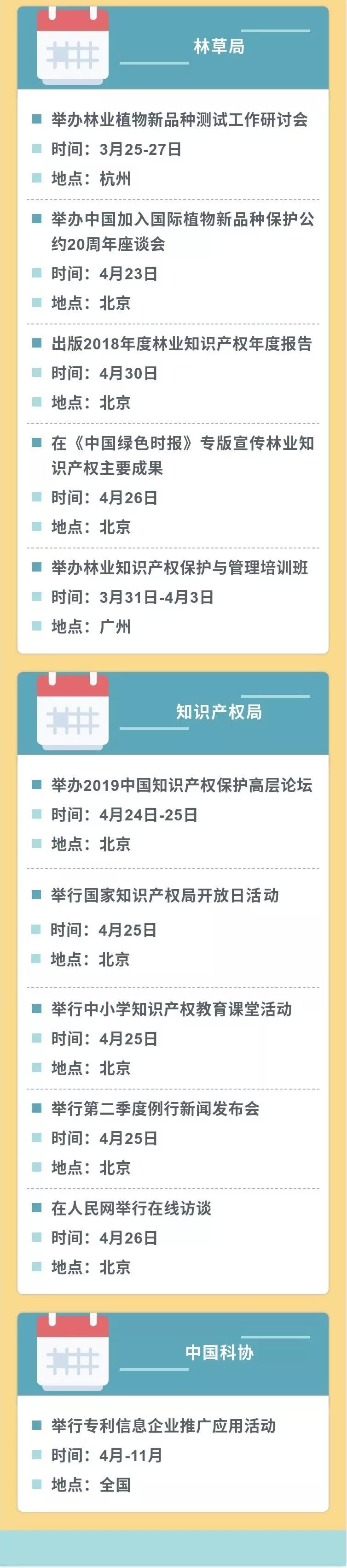 宣传周活动组委会主任、知识产权局局长申长雨介绍了宣传周期间重点活动安排。其中,市场监管总局在湖北开展集中销毁侵权假冒商品活动,国家版权局、知识产权局在国新办联合举行2018年中国知识产权发展状况新闻发布会,国家版权局举办中国网络版权保护与发展大会,最高人民法院发布《知识产权案件年度报告》,最高人民检察院介绍检察机关保护知识产权状况并发布典型案例,工业和信息化部发布网络版权年度报告,公安部公布2018年以来公安机关打击侵犯知识产权犯罪十大案例,司法部组织开展知识产权法治宣传教育主题活动,农业农村部组织开展农产品地理标志宣传活动,文化和旅游部组织开展知识产权保护宣传活动,卫生健康委举办卫生健康科学创新知识产权工作座谈会,海关总署发布中国海关知识产权保护状况及十佳案例,林草局举办中国加入国际植物新品种保护公约20周年座谈会并出版林业知识产权年度报告。上千场主题活动在全国范围内集中开展。